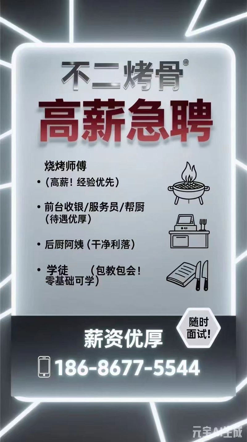 招聘长期烧烤店服务员!后厨!小时工!!后厨勤杂工!工资面议!地址桦南县泰和嘉苑北门!于记烧鸽子。联系电话13208402088